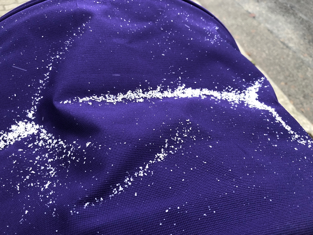 Kurz bevor es zur Morgenrunde geht wiederholt sich die Geschichte des gestrigen Abends (Kind füllt die Windel bis oben hin, Kleidung in Mitleidenschaft gezogen, kurzes Bad zur Reinigung). Gegen kurz nach elf können wir endlich starten. Es ist kühl geworden und Zoey nuckelt vor lauter Stress an ihrem Schnuller. Und dann kommt die große Überraschung. Es fällt etwas Weißes vom Himmel. Ob nun Schneeregen oder Hagel, egal, es ist weiß. Wir sind noch kurz in der Drogerie und wenn man in die Gesichter der Menschen schaut, sieht man dort keine Freude. Dieser Tag ist für viele ein ganz „normaler“ Montag. Ich wünsche mir, dass es meiner Tochter gelingt, das Leuchten in den Augen zu erhalten. Nach einer kleinen Schlummerphase freut sich Zoey riesig über den Schnee und quietscht voller Freude als er ihr ins Gesicht weht. Heute gibt es früher Mittag und es geht früher ins Bett.