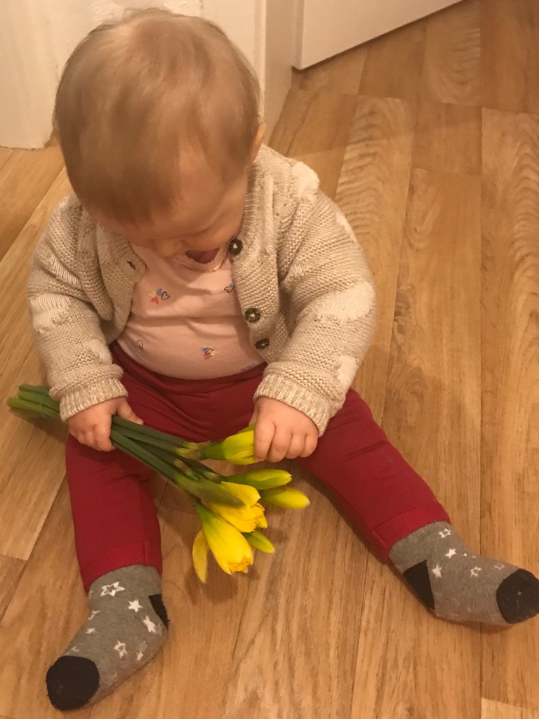 Nach unserer Rückkehr zeigt sie Kasia, was sie alles schon so gelernt hat. Sie präsentiert sich stolz, aber auch völlig cool beim Kabel ziehen, beim Blume umgraben, beim DVDs aussortieren und auch beim Ausräumen ihrer Spielzeugkisten. Als wir dann wieder alleine sind, bekommt die Prinzessin ihren Abendbrei und erledigt dabei noch ihr großes Geschäft. Im Nachgang zeigt sie dezent, aber bestimmt an, dass sie nicht weiter in dieser Windel sitzen möchte, indem sie versucht sich aufzustellen. Aber sie meckert und weint nicht. Ich beeile mich mit dem Füttern und dann gibt es die ersehnte neue Windel.